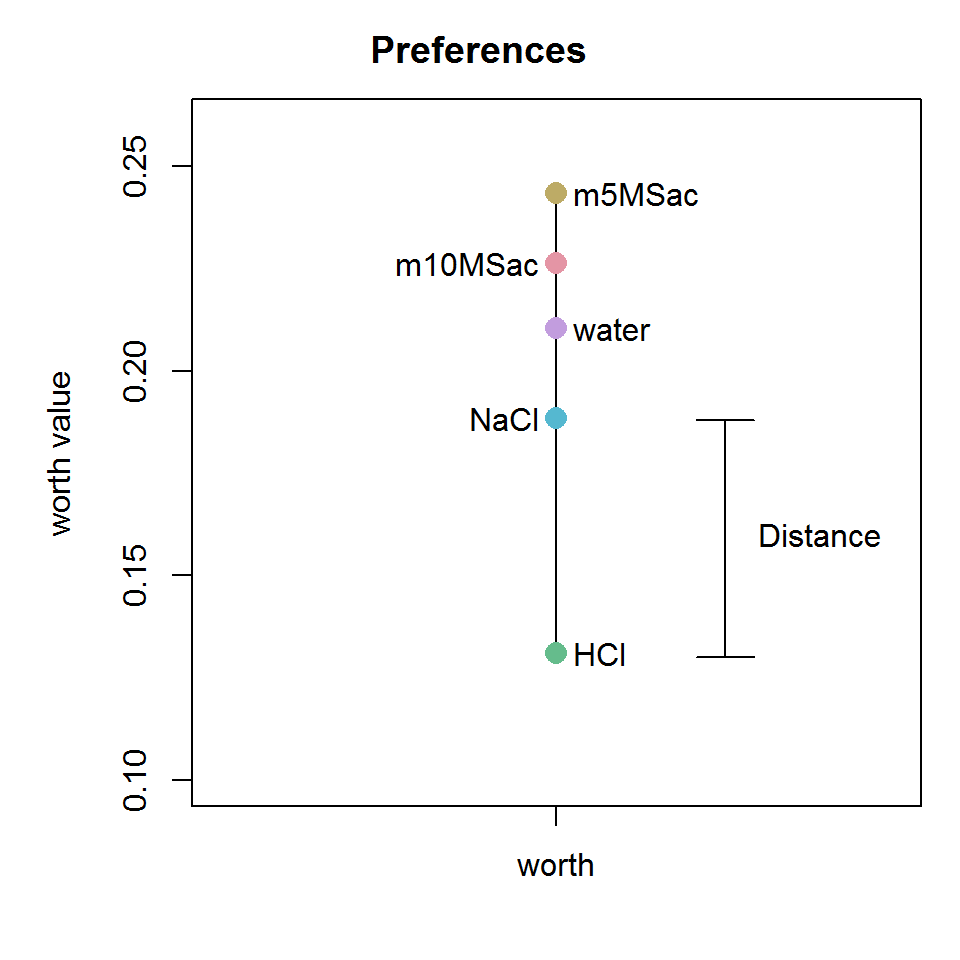 Consider the following worth plot for binary mouse data. The distance between two data points is simply the difference between worth values. In the distance matrix, the distances for all combinations are calculated.